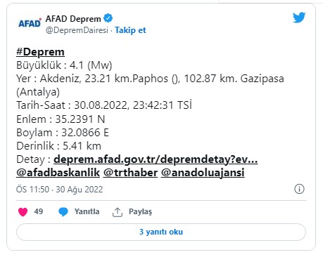 AFAD, Antalya'nın en doğusunda yer alan Gazipaşa ilçesinde 4.1 büyüklüğünde deprem meydana geldiğini duyurdu. Deprem saat 23.42'de yaşandı. Depremin derinliği ise 5.41 kilometre olarak kayıtlara geçti.