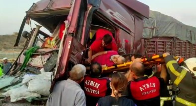 Kaza, Aydin-Izmir Otobani baglanti yolu Ovaeymir mevkiinde saat 19.00 siralarinda meydana geldi. Edinilen bilgiye göre, M.A.T. kontrolündeki 09 AEL 838 plakali tir, sürücüsünün henüz bilinmeyen bir nedenle direksiyon hakimiyetini kaybetmesi sonucu H.Y. idaresindeki 09 UG 675 plakali kamyona çarpti. Çarpmanin etkisi ile araçlar yaklasik 100 metre sürüklenerek durabildi. Kazada tirda sikisan sürücü ile kamyon sürücüsü ve yolcu konumunda bulunan kizi ve yegeni yaralandi. Kazayi görenler durumu 112 Acil Çagri Merkezi’ne bildirdi. Ihbar üzerine bölgeye saglik, polis ve itfaiye ekipleri sevk edildi. Kisa sürede olay yerine gelen Aydin Büyüksehir Belediyesi Itfaiye Daire Baskanligi ekipleri tir sürücüsünü sikistigi yerden çikartarak saglik ekiplerine teslim etti. Saglik ekipleri tarafindan da ilk müdahaleleri olay yerine yapilan yaralilar ambulanslarla hastaneye kaldirildi. Hastanede tedavi altina alinan tir sürücüsü M.A.T.’nin hayati tehlikesinin bulundugu ögrenildi.