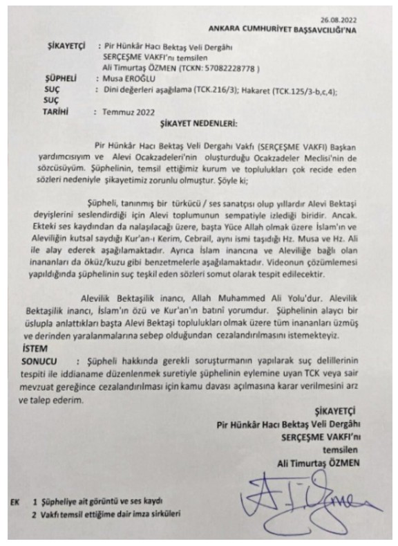 Alevi derneklerinden Pir Hünkar Hacı Bektaş Veli Dergahı Vakfı, ünlü türkücü hakkında Ankara Cumhuriyet Başsavcılığı'na şikayette bulundu.