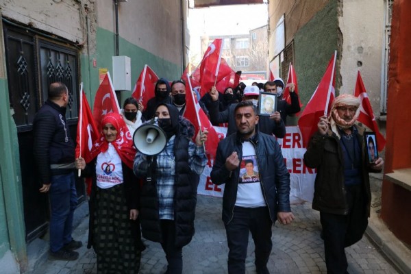 Ellerinde Türk bayrakları ve çocuklarının fotoğraflarıyla slogan atarak HDP İl Başkanlığı binasının önüne yürüyen aileler, dövizler taşıyarak yürüyüş yaptı.
