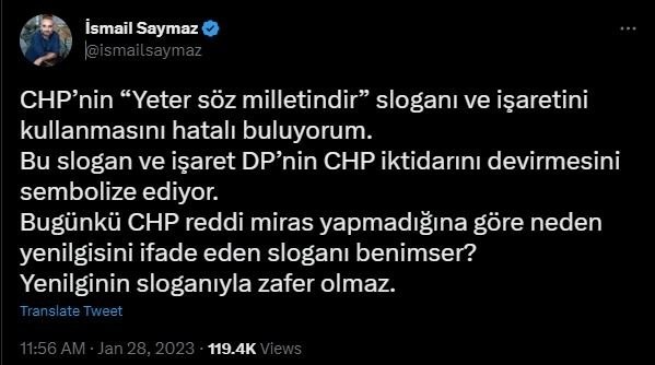 Halk TV yorumcusu ve yazarı İsmail Saymaz, CHP'yi, 'Yeter' Söz milletin' sloganı nedeniyle deyim yerinde ise topa tuttu. Saymaz, 'CHP'nin 'Yeter söz milletindir' sloganı ve işaretini kullanmasını hatalı buluyorum. Bu slogan ve işaret DP'nin CHP iktidarını devirmesini sembolize ediyor. Bugünkü CHP reddi miras yapmadığına göre neden yenilgisini ifade eden sloganı benimser? Yenilginin sloganıyla zafer olmaz.' dedi.