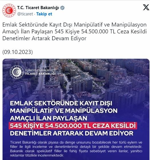 Ticaret Bakanlığı sosyal medya hesabı üzerinden paylaşımda bulundu. Bakanlık, "Emlak sektöründe kayıt dışı manipülatif ve manipülasyon amaçlı ilan paylaşan 545 kişiye 54.500.000 TL ceza kesildi. Denetimler artarak devam ediyor" açıklamasında bulundu.