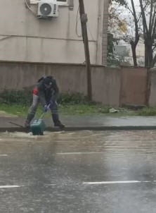 Yagis nedeniyle bazi cadde ve sokaklar sular altinda kaldi. Sular altina kalan yerler ve bir temizlik isçisinin tikanan gideri açmak için verdigi mücadele cep telefonu kamerasi ile görüntülendi.
