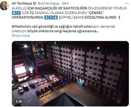 'Milletimizin can güvenliği ve sağlığını tehdit eden aynı zamanda ülkemizin büyük miktarda vergi kaybına uğramasına neden olan kaçak ve sahte alkollü içki ticaretinin engellenmesi amacıyla Emniyet Genel Müdürlüğü Kaçakçılık ve Organize Suçlarla Mücadele Başkanlığımız koordinesinde 81 il Emniyet Müdürlüklerimizce 'Çengel Operasyonu' gerçekleştirildi,