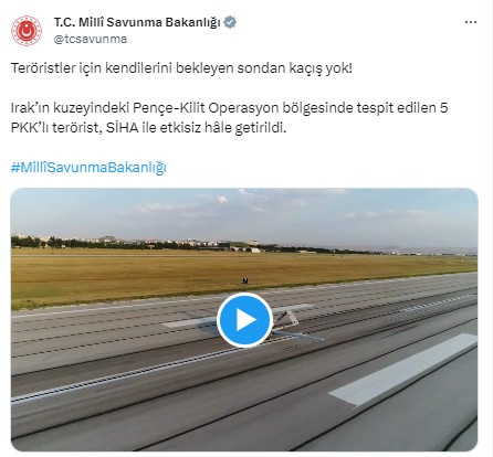 Milli Savunma Bakanlığı (MSB), sosyal medya hesabından 'Teröristler için kendilerini bekleyen sondan kaçış yok!' paylaşımda bulunarak 5 PKK'lı teröristin etkisiz hale getirildiğini açıkladı.MSB'den yapılan açıklamada, 'Irak'ın kuzeyindeki Pençe-Kilit Operasyon bölgesinde tespit edilen 5 PKK'lı terörist, düzenlenen hava harekâtıyla etkisiz hâle getirildi.' denildi.