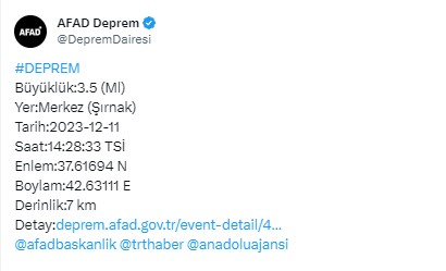 AFAD, Şırnak'ta 3.5 büyüklüğünde deprem meydana geldiğini duyurdu.