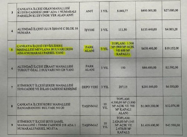 Yalçın şöyle devam etti: 'Ankara'nın Çankaya ilçesi, Cevizlidere Mahallesi'nde bulunan ve bölge halkına ait olan, çoluk çocuğun oyun alanı olarak kullandığı bin 500 metrekarelik parkın tamamını peşkeş çektiğini anladık. Planlı Alanlar İmar Yönetmeliğinin 19'uncu maddesi hükmünde yer alan 'Park alanlarında Encümen kararıyla Bin metrekare ve üzeri parklarda ahşap veya hafif yapı malzemelerinden yapılmak, kat adedi 1'i, yüksekliği 4.50 metreyi ve açık alanları dâhil taban alanları toplamda yüzde 3'ü, her birinin alanı 15 metrekareyi geçmemek kaydıyla çay bahçesi, büfe, muhtarlık, güvenlik kulübesi, parkın ihtiyacı için gerekli olan asgari ölçülerdeki trafo, parkın işlevini bozmayacak şekilde beton veya betonarme temel içermeyen spor aletleri, yapılabilir.' ifadelerine rağmen Yavaş, bu parkı 3 Milyon 300 bin TL'ye tamamını son zamanlarda açmakta olduğu büyük şubelerle dikkat çeken bir kuruyemiş markasına peşkeş çekti.