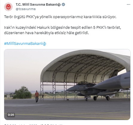 Milli Savunma Bakanlığı Irak’ın kuzeyindeki Hakurk bölgesinde tespit edilen 5 PKK'lı teröristin düzenlenen hava harekâtıyla etkisiz hale getirildiğini açıkladı.