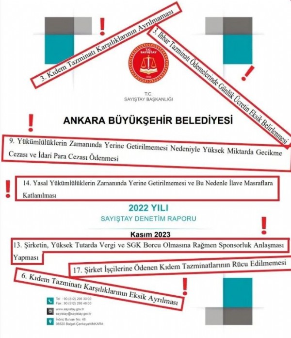 Ankara Büyükşehir Belediyesi iştiraki olan şirketlere ilişkin Sayıştay'ın 2022 raporlarında dikkat çeken bulgular yer aldı. Göreve geldiğinde 'yetim hakkı ve kul hakkını gözeteceğini' her fırsatta dile getiren ABB Başkanı Mansur Yavaş'ın söz konusu rapor sonuçlarına bakıldığı zaman hiçte söylediği gibi kul hakkı ve yetim hakkı gözetmediği anlaşıldı. 5 yıllık hizmet süresi boyunca Ankaralılara vaat ettiği hiçbir sözü yerine getirmeyen Mansur Yavaş, Ankara'ya da tek bir çivi çakmadan belediye iştiraki olan şirketleri borç batağına soktu.