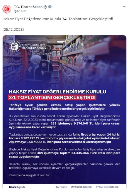 Ticaret Bakanlığı, fahiş fiyat artışı ve stokçuluğa ilişkin açıklamalarda bulundu. Bakanlık, "Haksız Fiyat Değerlendirme Kurulu tarafından fahiş fiyat artışı ve stokçuluk yaptığı tespit edilen 309 işletmeye toplam 24 milyon 345 bin 66 Türk lirası idari para cezası uygulanmıştır" ifadelerini bildirdi.