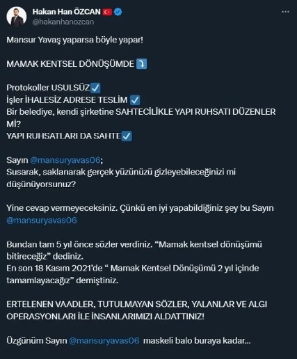 5 yıl önce Ankaralılara çeşitli vaatlerde bulunan CHP’li Ankara Büyükşehir Belediyesi (ABB) Başkanı Mansur Yavaş, göreve geldiği günden bu yana verdiği sözlerin hiç birini tutmadı. AK Parti Ankara İl Başkanı Hakan Han Özcan sosyal medya hesabından Mamak’ta bitmeyen ve usulsüzlük iddiaları gündemden düşmeyen kentsel dönüşümlerle ilgili açıklamalarda bulundu. ABB ile Belediye iştiraki olan PORTAŞ arasında yaptığınız yapım protokollerinin usulsüzlükle düzenlendiğini kaydeden Özcan, Yavaş'a "Meclis yetkisini gasp ettiniz. İhale ile yapılması gereken işleri, denetimden kaçırarak PORTAŞ A.Ş'ye devrettiniz. Mahkeme kararı ile protokol iptal edildi" diye seslendi.