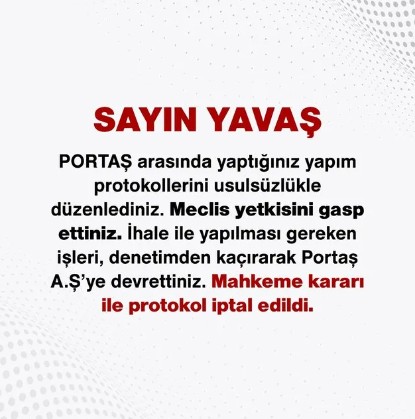 AK Parti Ankara İl Başkanı Hakan Han Özcan, Ankara Büyükşehir Belediyesi ile Belediye iştiraki olan PORTAŞ arasında yaptığınız yapım protokollerinin usulsüzlükle düzenlendiğini kaydeden Özcan, Yavaş'a 'Meclis yetkisini gasp ettiniz. İhale ile yapılması gereken işleri, denetimden kaçırarak PORTAŞ A.Ş'ye devrettiniz. Mahkeme kararı ile protokol iptal edildi' diye seslendi.