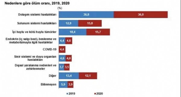 Ölüm nedenleri arasında dolaşım sistemi kaynaklı hastalıklar ilk sırada yer aldı Ölümler nedenlerine göre incelendiğinde, 2020 yılında yüzde 36 ile dolaşım sistemi hastalıkları ilk sırada yer aldı. Bu ölüm nedenini yüzde 15,8 ile solunum sistemi hastalıkları, yüzde 15,7 ile iyi ve kötü huylu tümörler izledi.