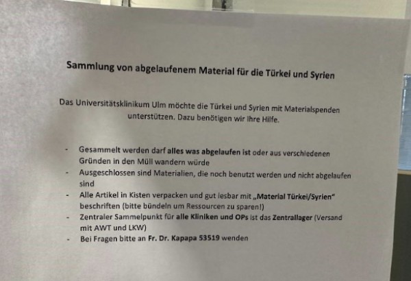 Baden Württember eyaletindeki Ulm Üniversite Hastanesi'nden yapılan yazılı bir duyuruda, deprem bölgelerine son kullanma tarihi geçmiş veya çöpe atılacak malzeme gönderilebileceği belirtildi. Yapılan duyuru Türk vatandaşların tepkisini çekerken, hastane yönetiminden konuyla ilgili açıklama geldi.