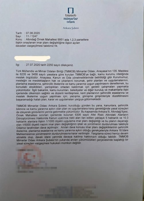 Çankaya Belediyesi'nde çalışırken 7,5 yıllık sürede sadece 60 kez işe giden ve İçişleri Bakanlığı Yüksek Disiplin Kurulu'nun kararıyla devlet memurluğundan çıkarılan Tezcan Karakuş Candan'ın başkanı olduğu Mimarlar Odası Ankara Şubesi, Ankara 18. İdare Mahkemesine giderek imar planı, şehircilik esas ve ilkelerine aykırı olduğu gerekçesiyle iptali ve yürütmesinin durdurulması talebiyle Çevre ve Şehircilik ve İklim Bakanlığı aleyhine dava açtı. Mahkeme, imar planı değişikliğinin iptali yönünde karar verdi.