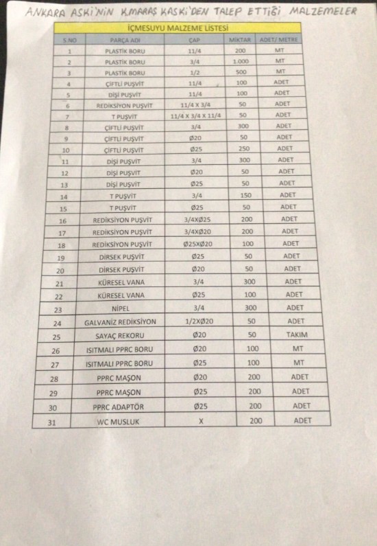 CHP'li Ankara Büyükşehir Belediyesi'nin depremde ağır hasar alan Kahramanmaraş'ın altyapı çalışmaları için talep ettiği malzeme listesi ortaya çıktı. ABB'nin talep ettiği listeyi paylaşan Ağrı Belediye Başkanı Savcı Sayan, "Bunları vermezseniz çalışma yapamayız demişler" dedi.