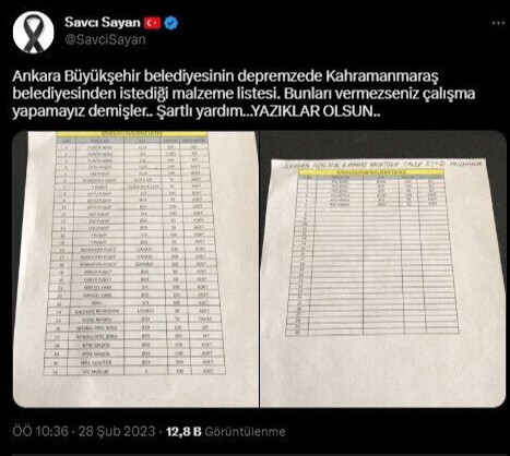 Ankara Büyükşehir Belediyesi'nin talep ettiği malzeme listesini sosyal medya hesabından paylaşan Ağrı Belediye Başkanı Savcı Sayan, 'Ankara Büyükşehir belediyesinin depremzede Kahramanmaraş belediyesinden istediği malzeme listesi. Bunları vermezseniz çalışma yapamayız demişler.. Şartlı yardım…YAZIKLAR OLSUN..' dedi.
