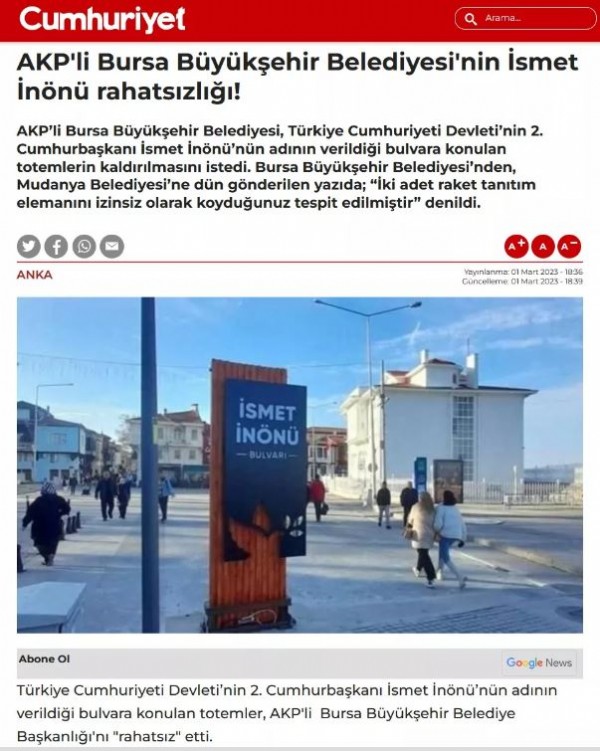 “Türkiye Cumhuriyeti Devleti'nin 2. Cumhurbaşkanı İsmet İnönü'nün adının verildiği bulvara konulan totemlerin kaldırılması istendi” şeklinde basına servis ettirilen haberde kullanılan görselde ise totem üzerindeki belediye logosu ve Mudanya Belediyesi yazısı silindi.