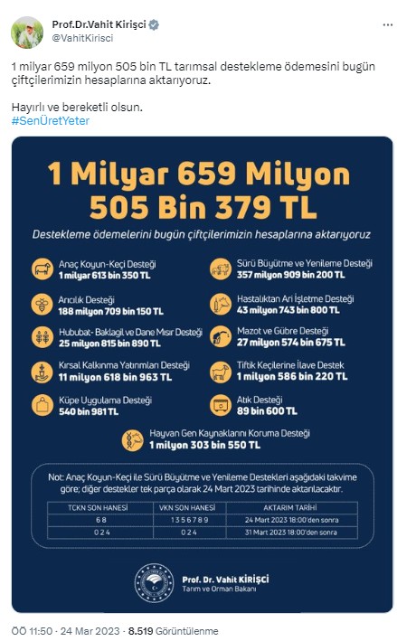 Tarım ve Orman Bakanı Vahit Kirişci "1 milyar 659 milyon 505 bin TL tarımsal destekleme ödemesini bugün çiftçilerimizin hesaplarına aktarıyoruz. Hayırlı ve bereketli olsun" dedi.