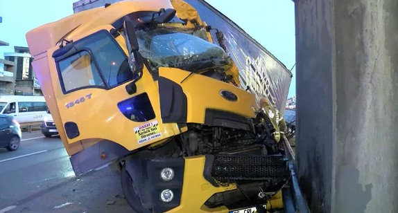 Pendik, D-100 Karayolu'nda şoförünün direksiyon hakimiyetini kaybettiği TIR, üst geçide çarptı. Kazada şoför yaralanırken, bölgede trafik yoğunluğu oluştu.