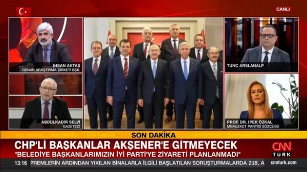 Muhalefetin 6'lı koalisyonu 1 yılda çöktü. Masanın büyük ortakları CHP ve İYİ Parti arasındaki savaş sonrası Kemal Kılıçdaroğlu ve Meral Akşener belediye başkanları ile parti genel merkezlerinde toplantı yaptı. CHP'li 10 belediye başkanının İYİ Parti Genel Başkanı Akşener'le bir araya geleceği iddia edildi. Ancak bu iddia ad masanın yaşadığı gibi bir kaosa dönüştü. Bazı yayın organları 'gidecek derken' bazıları ise 'gitmeyecek' dedi. Konuya ilişkin CHP'den açıklama geldi.