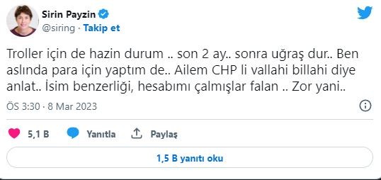 'Troller için de hazin durum. Son 2 ay, sonra uğraş dur.. Ben aslında para için yaptım de.. Ailem CHP'li vallahi billahi diye anlat.. İsim benzerliği, hesabımı çalmışlar falan. Zor yani..' diyerek AK Parti'li seçmen kitlesini hedef alan CHP'li “gazeteci” Payzın'ın paylaşımına kısa sürede çok sayıda tepki geldi.