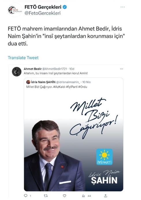 Firari FETÖ'cüden İYİ Partili İdris Naim Şahin'e dua! Adaylığı partiyi karıştırmıştı...