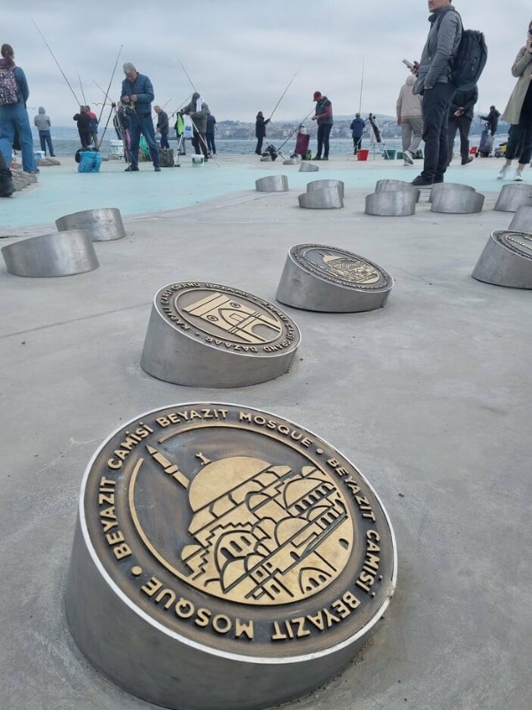 Sahilde oturma alanları yapılırken İstanbul'un önemli motiflerinden Ayasofya Camii, Kariye Camii ve Sultanahmet Camii'nin çıkartmaları hazırlanarak zemine yerleştirildi.