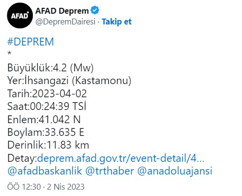 AFAD saat 00.24'te Kastamonu İhsangazi'de 4.2 büyüklüğünde bir deprem meydana geldiğini duyurdu. Depremin derinliği 11.83 kilometre olarak açıklandı.