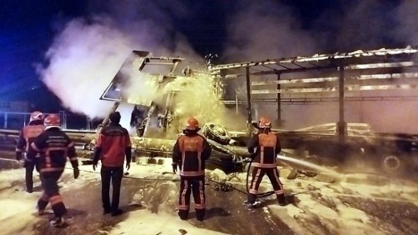 Sakaraya'nın Pamukova ilçesinde trafik levhaları ile bariyerlere çarparak alev alan TIR'ın şoförü, hayatını kaybetti.