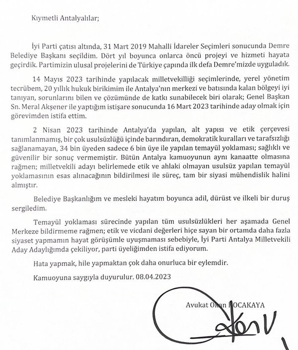 Okan Kocakaya kamuoyu ile paylaştığı açık mektupta milletvekilliği temayül yoklamasında siyasi mühendislik yapıldığını söyledi. Mektubun devamında uyarılara rağmen genel merkezin dikkate almadığını da belirten Kocakaya, '2 Nisan 2023 tarihinde Antalya'da yapılan, alt yapısı ve etik çerçevesi tanımlanmamış, bir usülsüzlüğü içinde barındıran, demokratik kuralları ve tarafsızlığı sağlanamayan, 34 bin üyeden sadece 6 bin üye ile yapılan temayül yoklaması; sağlıklı ve güvenilir sonuç vermemiştir. Bütün Antalya kamuoyunun aynı kanaatte olmasına rağmen; milletvekili adayı belirlemede etik ve ahlaki olmayan usulsüz yapılan temayül yoklamasının esas alınacağının bildirilmesi ile süreç, tam bir siyasi mühendislik halini almıştır' dedi.