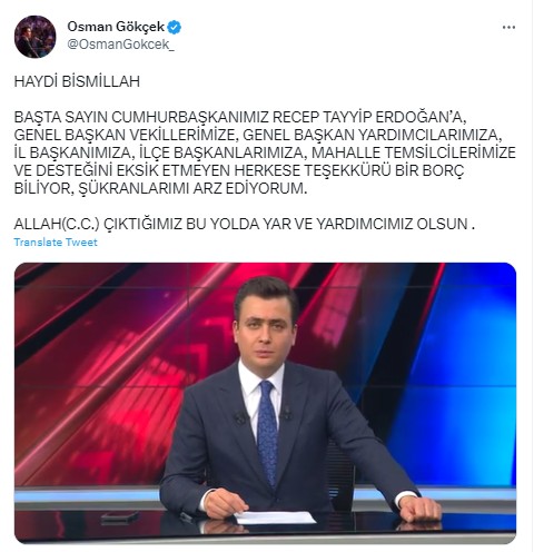 Ankara 2. Bölge 5. sıradan listede yer alan Osman Gökçek ilk açıklamasını sosyal medya hesabı üzerinden video mesaj yayınlayarak yaptı. 'Türkiye Yüzyılı' hedeflerine dikkat çeken Gökçek, 'Aslolan gönülleri fethetmek, milletimize hizmet etmektir.' ifadeleriyle duygularını dile getirdi.