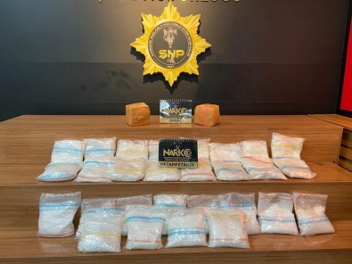 Sanliurfa’da pis tarafindan durdurulan araçta yapilan aramada 14 kilo 500 gram metamfetamin maddesi ile 2 kilo 200 gram eroin ele geçirildi.