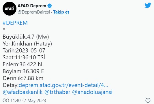 AFAD, saat 11.36'da 4,7 büyüklüğünde depremin meydana geldiğini açıkladı. Afetin derinliği ise 7.8 kilometre olarak açıklandı. Depremin merkez üssü olarak Kırıkhan ilçesini işaret edildi. Deprem, çevre illerden de hissedildi.