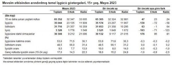 Hanehalkı İşgücü Araştırması sonuçlarına göre; 15 ve daha yukarı yaştaki kişilerde işsiz sayısı 2023 yılı Mayıs ayında bir önceki aya göre 193 bin kişi azalarak 3 milyon 328 bin kişi oldu. İşsizlik oranı ise 0,5 puan azalarak %9,5 seviyesinde gerçekleşti. İşsizlik oranı erkeklerde %7,7 iken kadınlarda %13,0 olarak tahmin edildi.