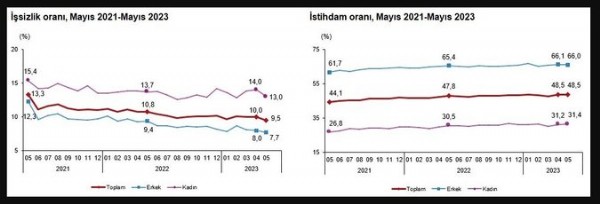 İstihdam edilenlerin sayısı 2023 yılı Mayıs ayında bir önceki aya göre 63 bin kişi artarak 31 milyon 716 bin kişi, istihdam oranı ise değişim göstermeyerek %48,5 oldu. Bu oran erkeklerde %66,0 iken kadınlarda %31,4 olarak gerçekleşti.