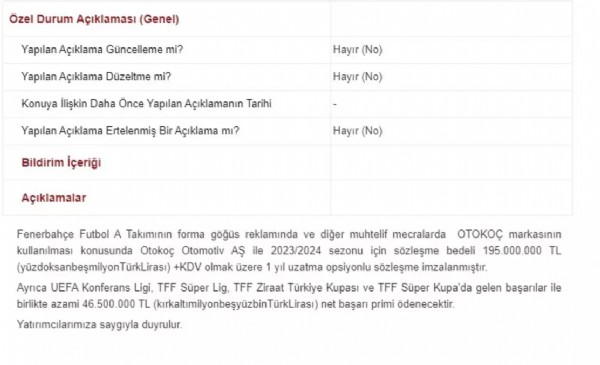 'Fenerbahçe Futbol A Takımının forma göğüs reklamında ve diğer muhtelif mecralarda OTOKOÇ markasının kullanılması konusunda Otokoç Otomotiv AŞ ile 2023/2024 sezonu için sözleşme bedeli 195.000.000 TL +KDV olmak üzere 1 yıl uzatma opsiyonlu sözleşme imzalanmıştır. Ayrıca UEFA Konferans Ligi, TFF Süper Lig, TFF Ziraat Türkiye Kupası ve TFF Süper Kupa'da gelen başarılar ile birlikte azami 46.500.000 TL net başarı primi ödenecektir.'