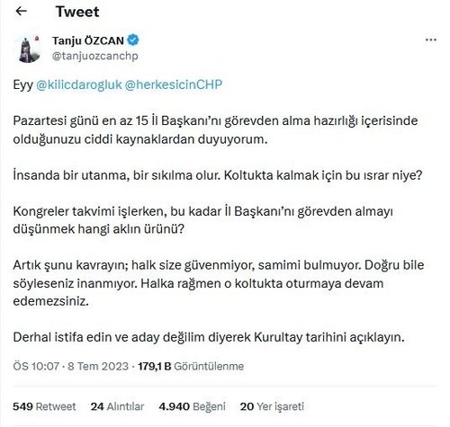 Tanju Özcan, Kılıçdaroğlu'nun 15 il başkanını görevden alma hazırlığı içerisinde olduğunu belirtti.