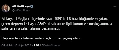 Malatya İli Yeşilyurt ilçesinde saat 16.39'da 4,8 büyüklüğünde meydana gelen depremde, başta AFAD olmak üzere ilgili kurum ve kuruluşlarımızla saha tarama çalışmalarına başlanmıştır.