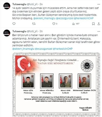Türkiye, Pençe Kilit Operasyonu'nda şehadete eren 9 evladına ağladı. Cumhuriyet Halk Partili İstanbul Büyükşehir Belediyesi ise yeni bir skandala imza attı. PKK'nın siyasi kanadı DEM Parti ile ittifak yapıp el sıkışan CHP'li İBB yönetimi şehitlerimizin emanetlerine saygısızlık yaptı. 2007 yılında Gabar'da şehit düşen Özel Kuvvetler Yüzbaşı Sinan Eroğlu'nun eşi Tuba Eroğlu'nun görevli olduğu İBB Şehit Yakınları ve Gazilerle İlişkiler Şube Müdürlüğü'nden sürüldüğü ortaya çıktı. Mobbinge uğrayan şehit eşi Tuba Eroğlu sosyal medyadan Ekrem İmamoğlu ve Özgür Özel için "Şimdi kalkıp da şehitlerimiz için başsağlığı öyle mi? Siz bir şehit eşine sahip çıkamadınız" ifadelerini kullandı.