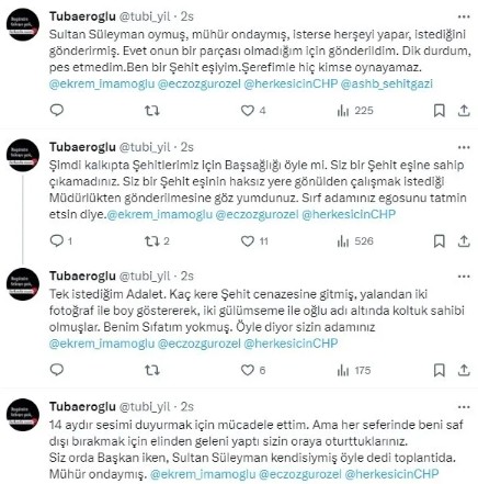 Şimdi kalkıp da şehitlerimiz için başsağlığı öyle mi? Siz bir şehit eşine sahip çıkamadınız. Siz bir şehit eşinin haksız yere gönülden çalışmak istediği müdürlükten gönderilmesine göz yumdunuz. Sırf adamınız egosunu tatmin etsin diye. Tek istediğim adalet. Kaç kere şehit cenazesine gitmiş, yalandan iki fotoğraf ile boy göstererek, iki gülümseme ile oğlu adı altında koltuk sahibi olmuşlar.