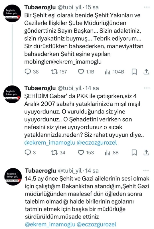 Sosyal medya hesabı üzerinden skandala ilişkin paylaşımlarda bulunan şehit eşi Tuba Eroğlu, yaşadığı mobbingi anlattı. 'Şehidim Gabar'da PKK ile çatışırken, siz 4 Aralık 2007 sabahı yataklarınızda mışıl mışıl uyuyordunuz. O vurulduğunda siz yine uyuyordunuz… O Şehadetini verirken, son nefesini, siz yine uyuyordunuz o sıcak yataklarınızda. Neden? Siz rahat uyuyun diye. 14,5 ay önce Şehit ve Gazi ailelerinin sesi olmak için çalıştığım Bakanlıktan atandığım Şehit Yakınları Gazi Müdürlüğü'nden maalesef dün öğleden sonra talebim olmadığı halde birilerinin egolarını tatmin etmek için başka bir müdürlüğe sürdürüldüm. Müsaade ettiniz.