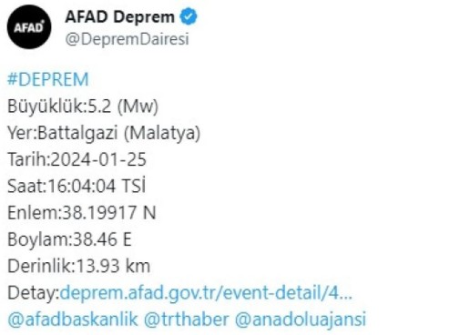 AFAD tarafından son dakika deprem açıklaması geldi. Malatya'nın Battalgazi ilçesinde saat 16.04'de 5.2 büyüklüğünde deprem meydana geldi. Sarsıntı çevre illerden de hissedildi.