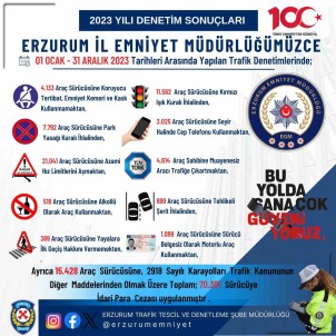 1 Ocak - 31 Aralik 2023 tarihleri arasinda yapilan bir yillik denetim ve çalismalarda; Erzurum’da 4 bin 133 araç sürücüsüne koruyucu tertibat, emniyet kemeri ve kask kullanmamaktan, 7 bin 792 araç sürücüsüne park yasagi kurali ihlalinden, 21 bin 41 araç sürücüsüne azami hiz limitlerini asmaktan, 519 araç sürücüsüne alkollü olarak araç kullanmaktan, 389 araç sürücüsüne yayalara ilk geçis hakkini vermemekten, 11 bin 562 araç sürücüsüne kirmizi isik kurali ihlalinden, 3 bin 25 araç sürücüsüne seyir halinde cep telefonu kullanmaktan, 6 bin 614 araç sahibine muayenesiz araci trafige çikartmaktan, 699 araç sürücüsüne tehlikeli serit ihlalinden ve bin 99 araç sürücüsüne sürücü belgesiz olarak motorlu araç kullanmaktan ceza yazildi.
