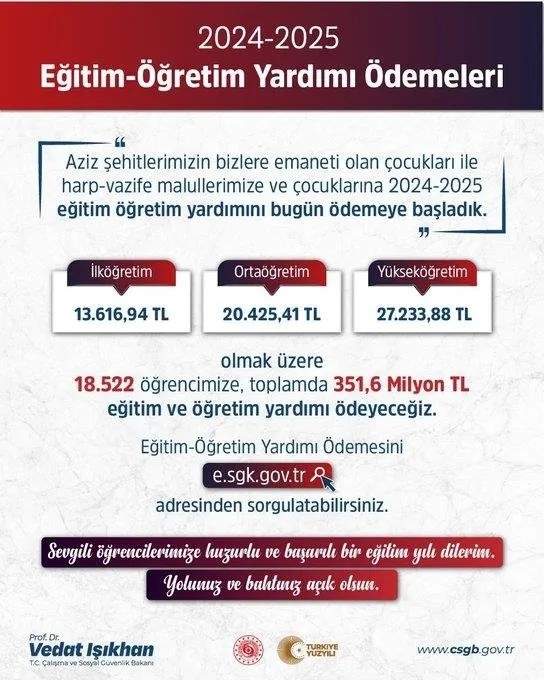 'Aziz şehitlerimizin bizlere emaneti kıymetli evlatlarımıza, harp-vazife malullerimize ve çocuklarına eğitim yardımı sağlıyoruz. 2024-2025 eğitim-öğretim yardımını bugün itibarıyla ödemeye başladık. 18 bin 522 öğrencimize toplamda 351,6 milyon lira eğitim-öğretim yardımı gerçekleştireceğiz. Sevgili öğrencilerimize başarılı bir eğitim yılı diliyorum. Her zaman yanınızdayız'