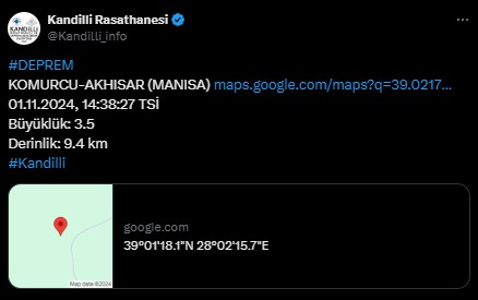 Kandilli Rasathanesi'nden alınan verilere göre Manisa'da 3.5 büyüklüğünde bir deprem meydana geldi.