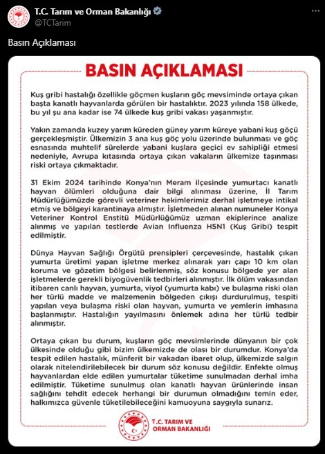 Ortaya çıkan bu durum, kuşların göç mevsimlerinde dünyanın birçok Ülkesinde olduğu gibi bizim ülkemizde de olası bir durumdur. Konya'da tespit edilen hastalık, münferit bir vakadan ibaret olup, ülkemizde salgın olarak nitelendirilebilecek bir durum söz konusu değildir. Enfekte olmuş hayvanlardan elde edilen yumurtalar tüketime sunulmadan derhal imha edilmiştir. Tüketime sunulmuş olan kanatlı hayvan ürünlerinde insan sağlığını tehdit edecek herhangi bir durumun olmadığını temin eder, halkımızca güvenle tüketilebileceğini kamuoyuna saygıyla sunarız.”
