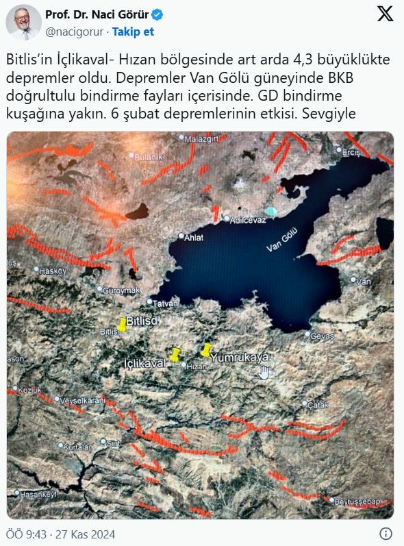 Konuya ilişkin Yer Bilimci ve Deprem Uzmanı Prof. Dr. Naci Görür açıklamalarda bulundu. Yer Prof. Dr. Görür, “Bitlis'in İçlikaval- Hızan bölgesinde art arda 4,3 büyüklükte depremler oldu. Depremler Van Gölü güneyinde BKB doğrultulu bindirme fayları içerisinde. GD bindirme kuşağına yakın. 6 Şubat depremlerinin etkisi” dedi.