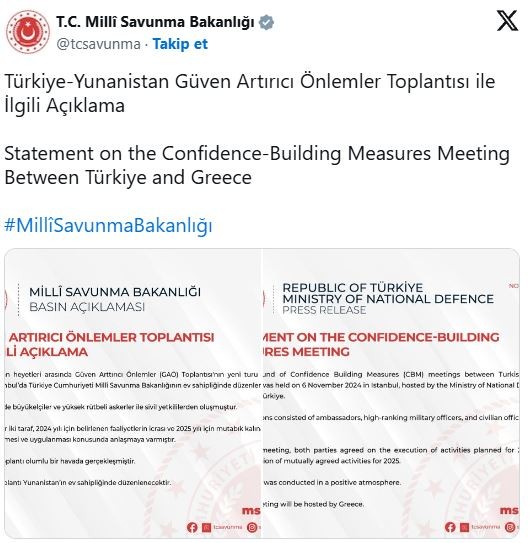 Milli Savunma Bakanlığı, " Yunanistan ile Güvenlik Arttırıcı Önlemler Toplantısı) "Her iki tarafın 2024 yılı için belirlenen faaliyetlerin icrası ve 2025 yılı için mutabık kalınan faaliyetlerin hayata geçirilmesi ve uygulanması konusunda anlaşmaya varılmıştır"