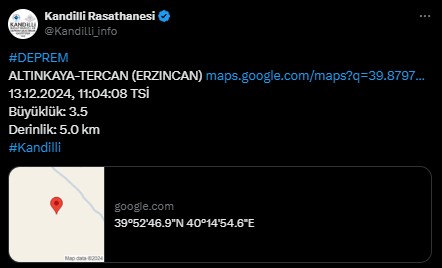 Kandilli Rasathanesi'nden alınan verilere göre Erzincan'da 3.5 büyüklüğünde bir deprem meydana geldi.